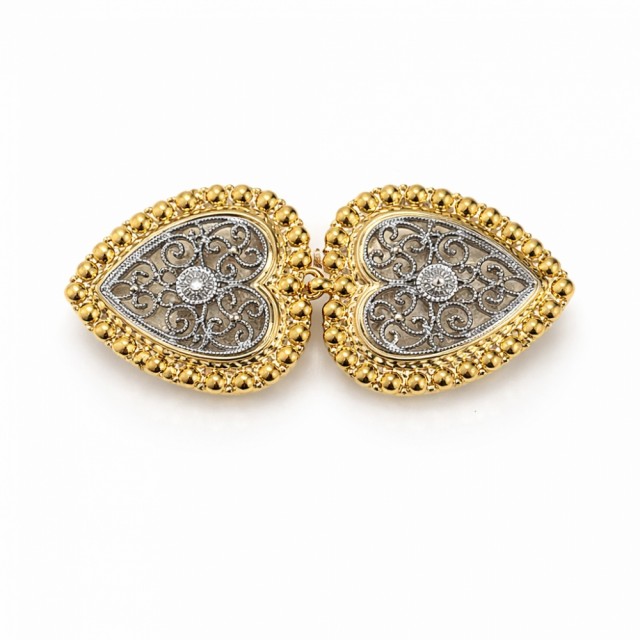 Beltespenne, forgylt Beltespennen er hjerteformet med forgylte flate. Den er omkranset med nydelig perlekant og rhodinert filigran dekor med kruse i midten. PrisNOK449,00 inkl. mva. På lager Kjøp Ønskeliste Del dette Produktinfo Beltespenne: høyde: 40 mmbredde: 93 mm beltespennen er forsølvet med forgylt og rhodinert overflate. Best egnet til skinnlist, men det lar seg også gjøre å montere på stofflist og ved å snitte fire hull. Alle våre produkter er 100% nikkelfrie.