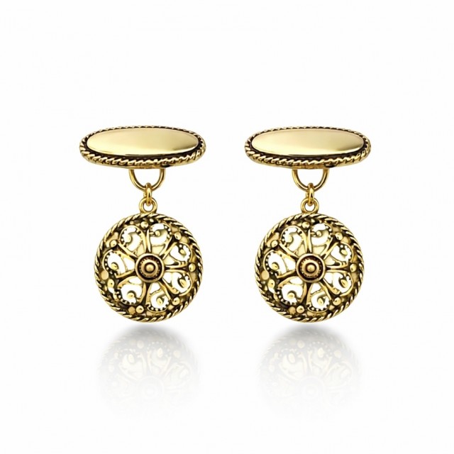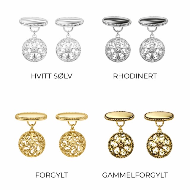 Mansjettknapper, gammelforgylt Mansjettknappene er dekorert med fine ornamenter. Disse passer fint til Eva søljer som også er gammelforgylt. PrisNOK299,00 inkl. mva. På lager Kjøp Ønskeliste Del dette Produktinfo - Diameter på mansjett: 1,5 cm - Mål på holder: 2 x 1 cm - Forgylt med oksidert overflate. Alt er nikkelfritt. Trengs ikke å pusses (ikke sølv).
