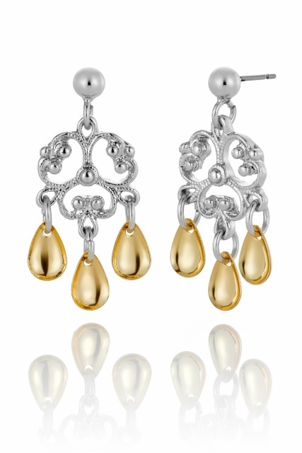 Ørepynt: rhodinert overflate og forgylte dråpeløv.
