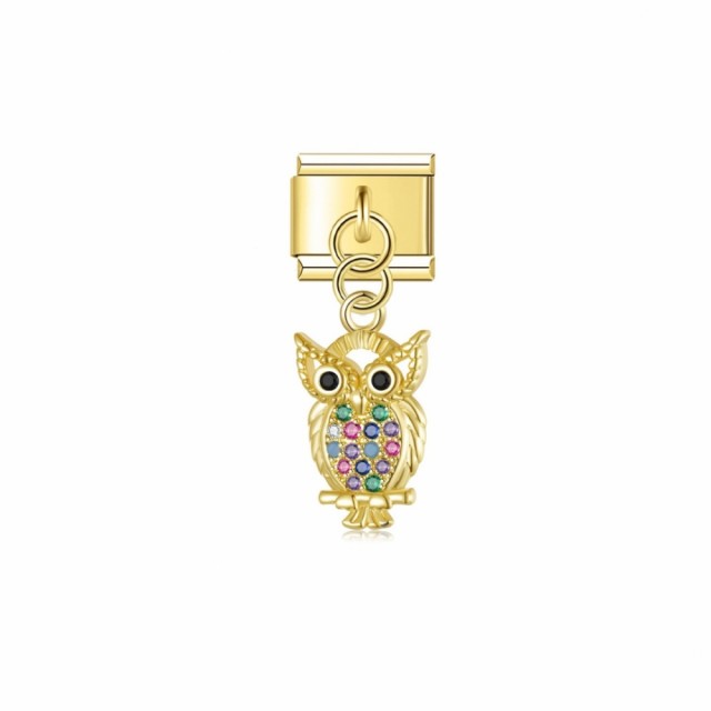 Firenze ledd - gull heng m/ ugle Elegant charm med uglemotiv, dekorert med fargerike stener. Uglen er et symbol på visdom og beskyttelse. PrisNOK249,00 inkl. mva. På lager Kjøp Ønskeliste Del dette Produktinfo Metall: Stainless steelBredde: 9mmDenne charmsen passer fint til armbåndene som var for 20 år siden, både Firenze og Nomination.
